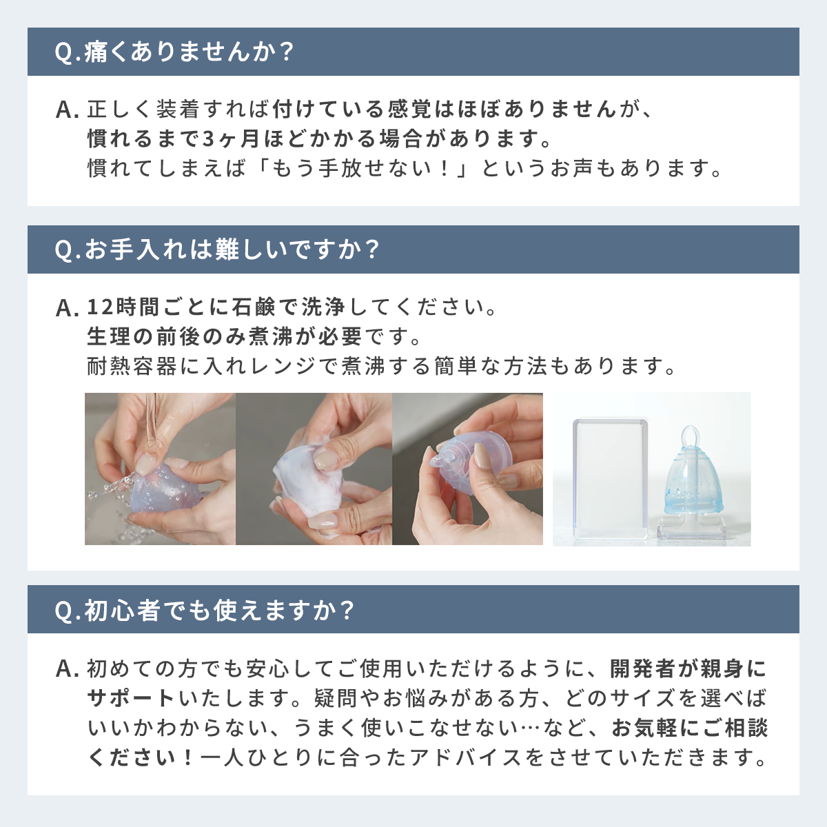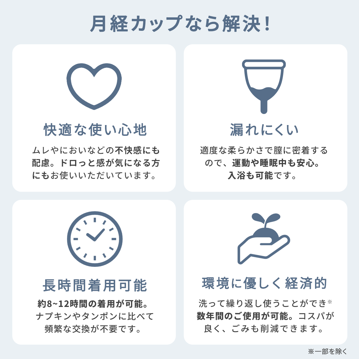 ・多くのサイズやモデルにより、一人ひとりのからだや経血量・使用シーンに合わせて最適な月経カップを選ぶことが出来ます。