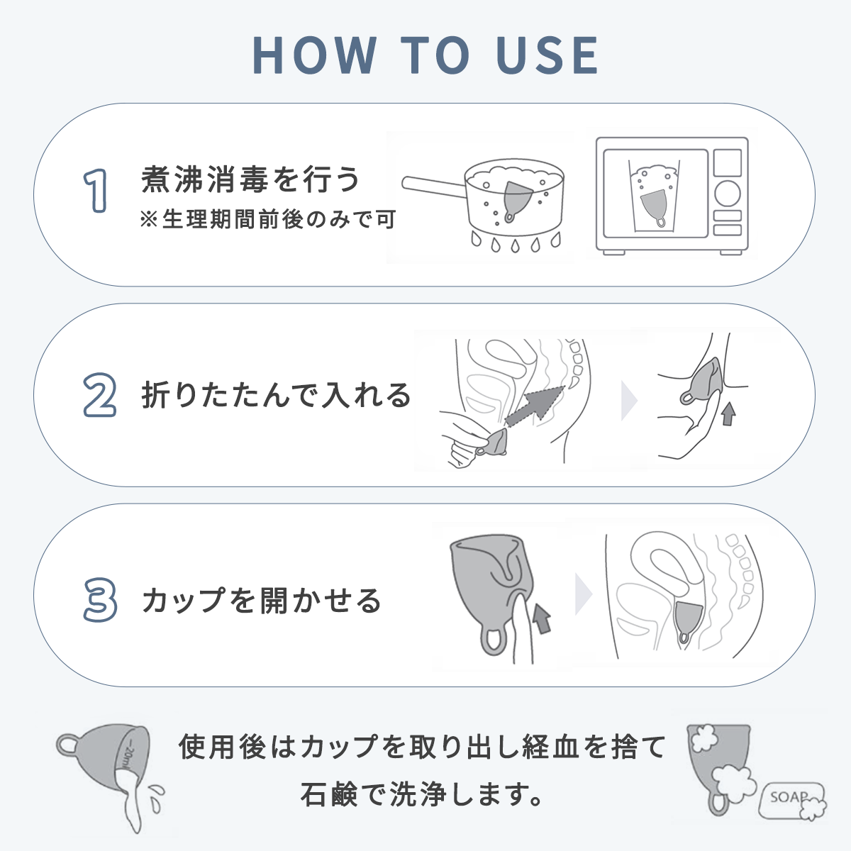 ・適度な柔らかさの月経カップは膣に密着し漏れにくく、運動や睡眠中も安心。入浴も可能です。